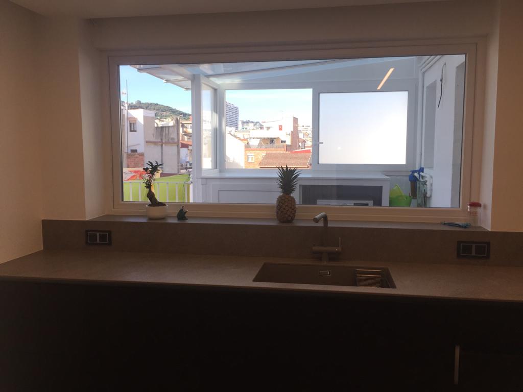 Proyecto integral de cocina y salón con vistas al Mediterráneo. Materiales naturales y líneas limpias.